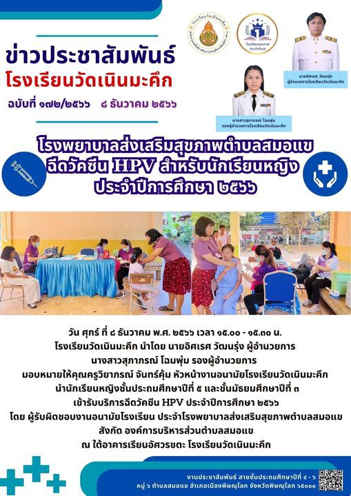 โรงพยาบาลส่งเสริมสุขภาพตำบลสมอแข ฉีดวัคซีน HPV สำหรับนักเรียนหญิง ประจำปีการศึกษา 2566
