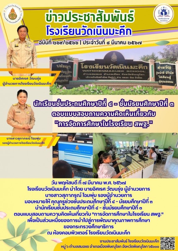 นักเรียนชั้นประถมศึกษาปีที่ 4 - มัธยมศึกษาปีที่ 3 ตอบแบบสอบถามความคิดเห็นเกี่ยวกับ การจัดการศึกษาในโรงเรียน สพฐ.