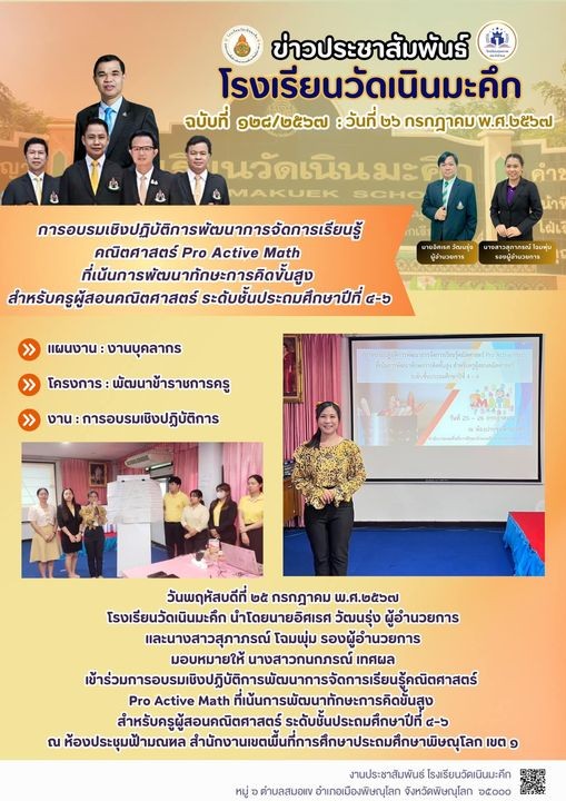 “การอบรมเชิงปฏิบัติการพัฒนาการจัดการเรียนรู้คณิตศาสตร์ Pro Active Math ที่เน้นการพัฒนาทักษะการคิดขั้นสูง สำหรับครูผู้สอนคณิตศาสตร์ ระดับชั้นประถมศึกษาปีที่ 4-6” |